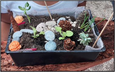 - Au départ, chaque participant reçoit un contenant qu'il va embellir et transformer peu à peu en un jardin éphémère des 5 sens.